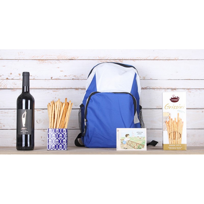 תיק גב שימושי לטיולים וליום – יום, יין אמירים וגריסיני איטלקי פריך באפייה, באריזת צלופן חגיגית.