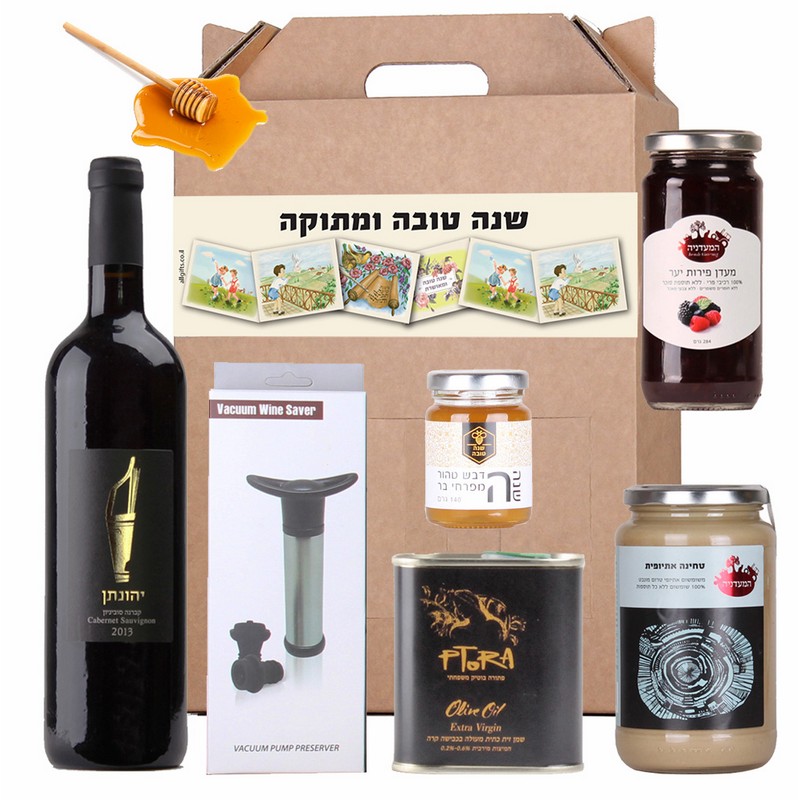 בקבוק יין איכותי, ריבת מעדן 100% פרי "המעדניה", משאבת ואקום לשימור יין, שמן זית בפח 250 מ"ל ודבש 120 גר', טחינה אתיופית, במארז חגיגי.